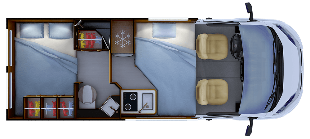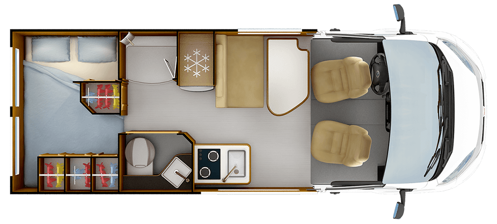 • Rangement sous bloc cuisine avec tiroirs pour couverts et casseroliers, revêtement intérieur PVC haute résistance, verrouillage centralisé électrique et alarme au démarrage moteur en cas de non-verrouillage