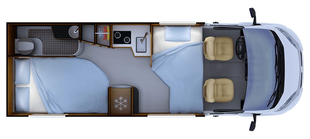 • Rangement sous bloc cuisine avec tiroirs pour couverts et casseroliers, revêtement intérieur PVC haute résistance, verrouillage centralisé électrique et alarme au démarrage moteur en cas de non-verrouillage