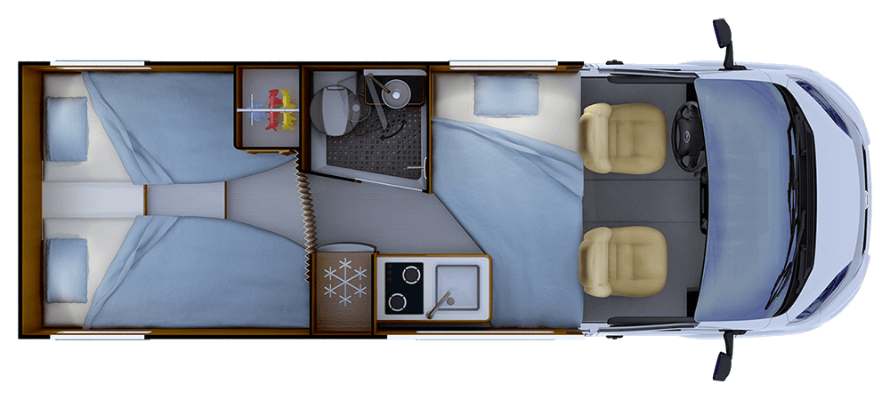 • Rangement sous bloc cuisine avec tiroirs pour couverts et casseroliers, revêtement intérieur PVC haute résistance, verrouillage centralisé électrique et alarme au démarrage moteur en cas de non-verrouillage